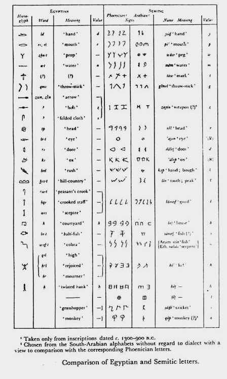 Diringer suggests that the north-western Semitic inventor or inventors (Canaanites, Hebrews, or Phoenicians) of the alphabet were influenced by Egyptian writing ; he thinks that they were probably also acquainted with most of the scripts current in the eastern Mediterranean. He suggests that the original letters were probably conventional signs and not pictures used as ideograms. "The great achievement in the creation of the alphabet was not the invention of signs but the inner working principle... each sound represented by one symbol and each symbol generally represents one sound"(Diringer 1976: 619 and also see Gelb 1976: 1086).This is arguable - the Egyptians and the Ugaritians had more or less achieved 'the alphabetic principle'. What made the alphabet ultimately successful was the selection of the forms of the characters and the limitation of the number of distinct sounds which the characters represented (omitting all the refinements of vowel and consonantal sounds which modern phonetics has identified). Driver, after comparing the Semitic, Egyptian and cuneiform characters, concluded that "the borrowing of the Phoenician alphabet can hardly have been immediate....the Egyptian signs ... show few, if any, close resemblances to the Phoenician letters... and [when there is resemblance of signs] the value of the signs does not generally agree."(Driver 1954; 139} This one can see for oneself.