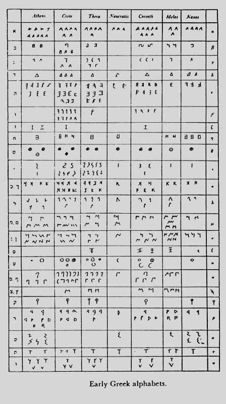 Figure 4 shows early Greek alphabets arranged in the order of the Hebrew alphabet. Though, according to Herodotus (Rawlinson 1958: 25), the characters originally in use in various parts of Greece differed, there is on the whole little variation except perhaps for some of the vowels and for the letters R and B. There is no indication that the shapes of the characters have any relation to the forms of the hieroglyphs or of the cuneiform signs shown in Figures 2 and 3.