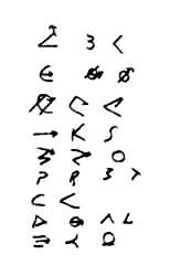 A few comments on the extent to which the characters in the table generally resemble characters in other familiar alphabets. I have already mentioned that many of the characters are similar to the Roman characters, apart from their direction of alignment, and that a few resemble classical Greek characters not found in the Roman alphabet. Most of the characters are similar to Etruscan forms; I have mentioned the character for H as a particular case but those for M and N are also very similar. Early Greek forms of the characters bring out the degree of variation in the alignment of characters, for example the characters gamma and kappa can be seen placed at many different angles; in Athens the alpha was placed on its side. In different locations there was a variety of forms for rho, some resembling the Roman R, others like the Roman D or P. Comparison can also be made with other alphabets such as the glagolitic and the runic alphabet. Little close similarity can be observed - they appear to be independent inventions. The only broad resemblance of the glagolitic alphabet that strikes me is, at some distance, to Alexander Bell's Visible Speech!